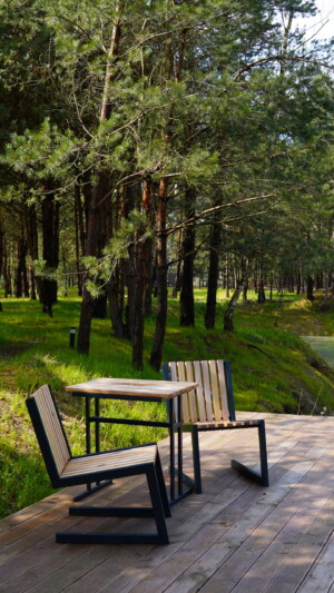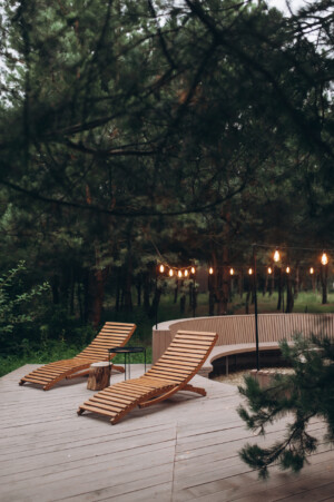 Велика тераса дозволяє не відходячи від будиночка зануритися в красу соснового вічнозеленого лісу.
