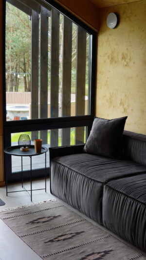 Сауна з сучасною електричною системою нагрівання. Панорамні вікна дозволяють насолоджуватися прекрасним видом на ліс.