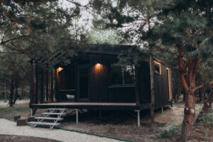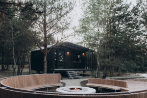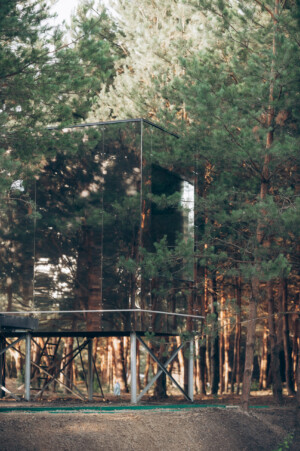 Unique cabin with a mirrored exterior and the first of its kind in Ukraine. It was designed with one open window facade, offering stunning views overlooking the lake.
